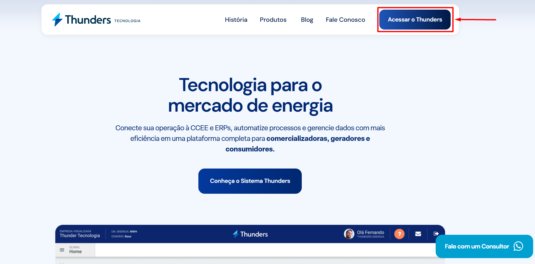 Nesta opção, o usuário acessa o site da plataforma Thunders clicando no link [www.thunders.com.br], clica em “Acessar o Thunders” e informa seu e-mail e senha cadastrados na plataforma.