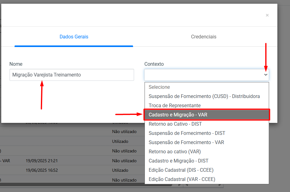Na sequência, é necessário definir um nome para a integração e selecionar o contexto correspondente. Para o segmento varejista, a opção correta será sempre Cadastro e Migração - VAR, como mostrado na imagem abaixo. As demais alternativas são de uso exclusivo das distribuidoras e não se aplicam ao produto voltado ao varejista.