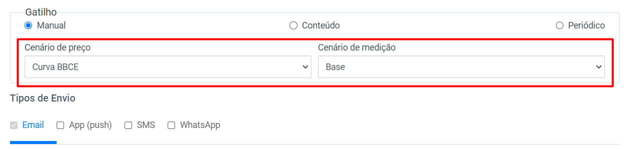Manual: Neste gatilho de disparo de e-mail, se faz necessária a definição de dois cenários distintos, o Cenário de preço e o Cenário de medição.