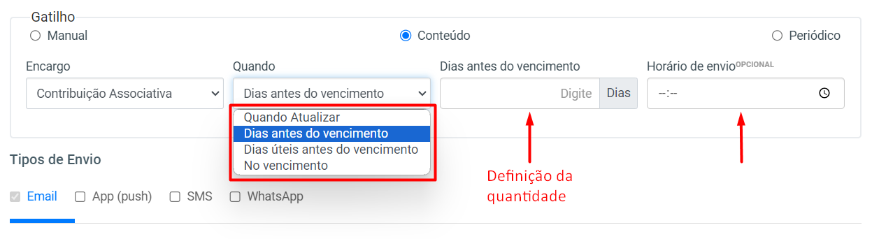 Dias antes do vencimento / Dias úteis antes do vencimento: para que o gatilho de disparo envie X dias antes do vencimento ou X dias úteis antes do vencimento. Sendo necessário o preenchimento da quantidade de dias e caso desejado, é disponibilizado o campo Horário de envio (opcional)para ser preenchido.