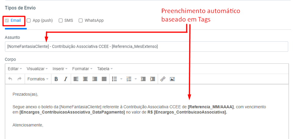 Assunto: Descrição do assunto do e-mail a ser enviado. Este campo, fundamentado em Tags copiáveis, é inicializado automaticamente após a definição das opções de Template padrão inseridas no início desta janela de configuração, porém o usuário pode editar o assunto como desejar.