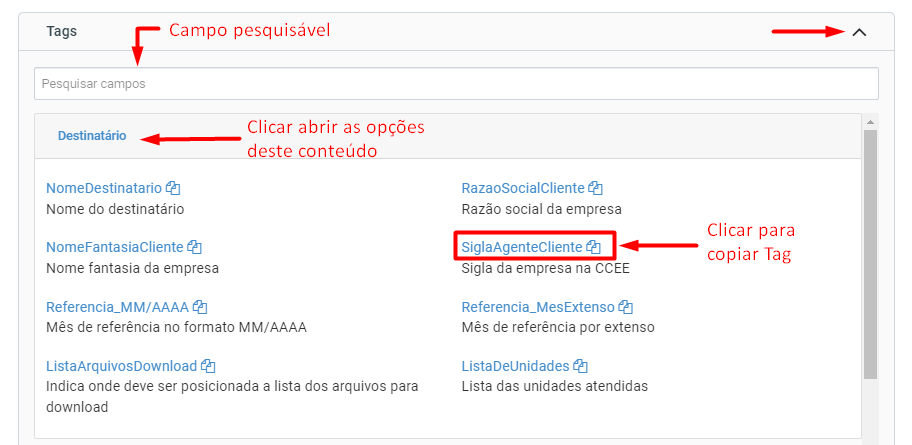 Tags: Ao clicar em “Tags”, uma janela contendo definições de Tags, irá se abrir. Nela, encontra-se o campo de pesquisa onde se pode selecionar uma Tag específica e logo abaixo é encontrado os conteúdos com todas as Tags disponíveis.