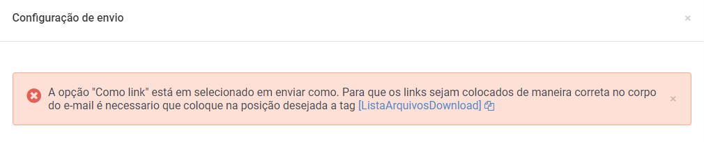 - Enviar como: Apresenta três opções de envio, são elas: "Não enviar" (o e-mail será enviado somente com o corpo de texto); "Como anexo" (escolher o relatório desejado no campo Templates ao lado direito) e Como link (escolher o relatório ou lista de arquivos no campo Templates ao lado direito e clicar em Salvar. Uma mensagem de alerta irá aparecer no topo da tela indicando a o caminho para a configuração para esta opção).