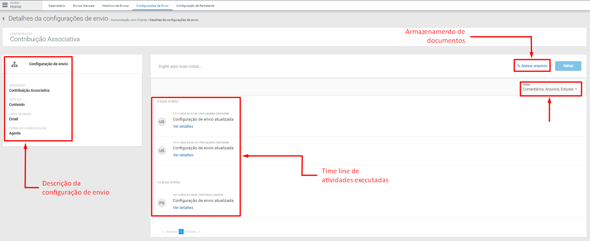 Ainda na Grid principal de Configuração de Envio, clicando no descritivo de cada configuração é exibida a Timeline desta configuração. Aqui, pode-se verificar um resumo da configuração, além de apresentar o histórico de atividades executadas (dia, horário e qual usuário). É possível também, fazer upload de arquivos como armazenamento de dados e efetuar pesquisas de atividades por meio do filtro de exibição. Estas informações são mostradas na imagem abaixo: