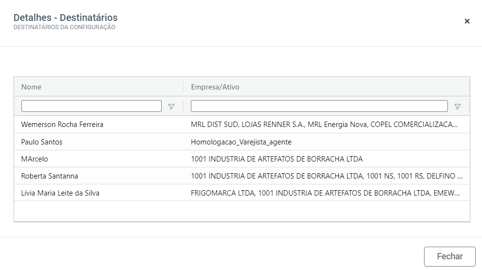 De maneira semelhante, clicando no número na coluna de Destinatários na Grid principal da tela de Configuração de Envio, é mostrado o detalhamento de todos os destinatários cadastrados para cada configuração de envio criada. Como mostra a imagem a seguir: