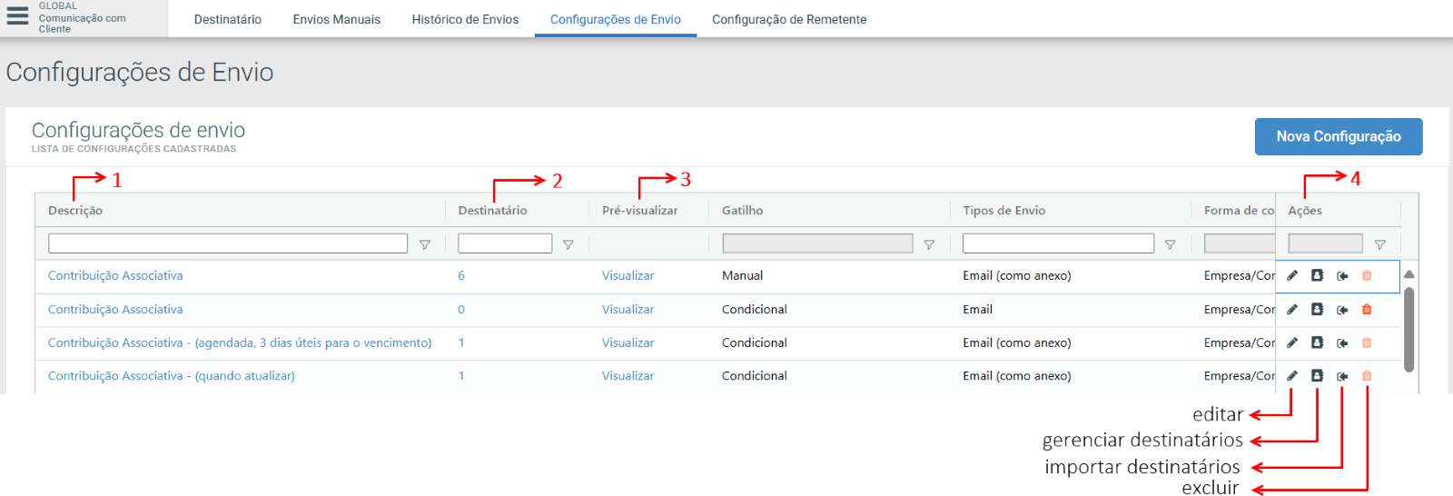 2 - Nesta coluna é apresentado a quantidade de destinatário por cada configuração criada.