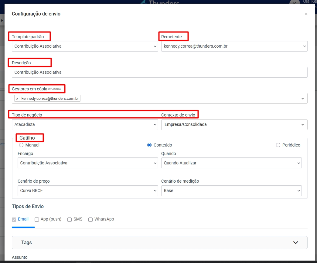 Tipos de Envio: Neste campo da tela é definido o tipo da forma de envio, contendo as opções de E-mail, App (push), SMS e WhatsApp. Atualmente, está habilitado para escolha o canal de comunicação na forma de E-mail, porém, caso o usuário se interesse por alguma das outras formas de envio, basta clicar na caixa correspondente e entrar em contato com a Thunders para saber mais sobre.