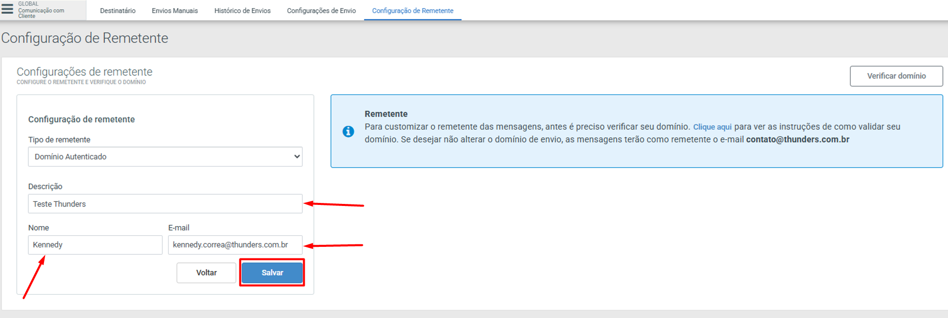 Se sua empresa já utilizava a primeira versão do módulo de comunicação e a equipe de TI já realizou os ajustes de DNS necessários no domínio de e-mail, basta nos informar: a nova versão poderá ser habilitada em aproximadamente 48 horas. Caso seja necessário configurar algo adicional, a própria tela de Configuração de Remetente permitirá concluir o processo.