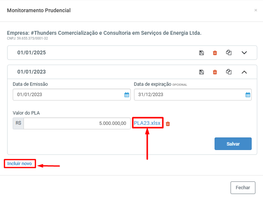 É importante observar a vigência da declaração. Caso seja necessário informar um novo valor de PLA, não substitua diretamente o registro anterior. Utilize a opção Incluir Novo para cadastrar uma nova declaração.