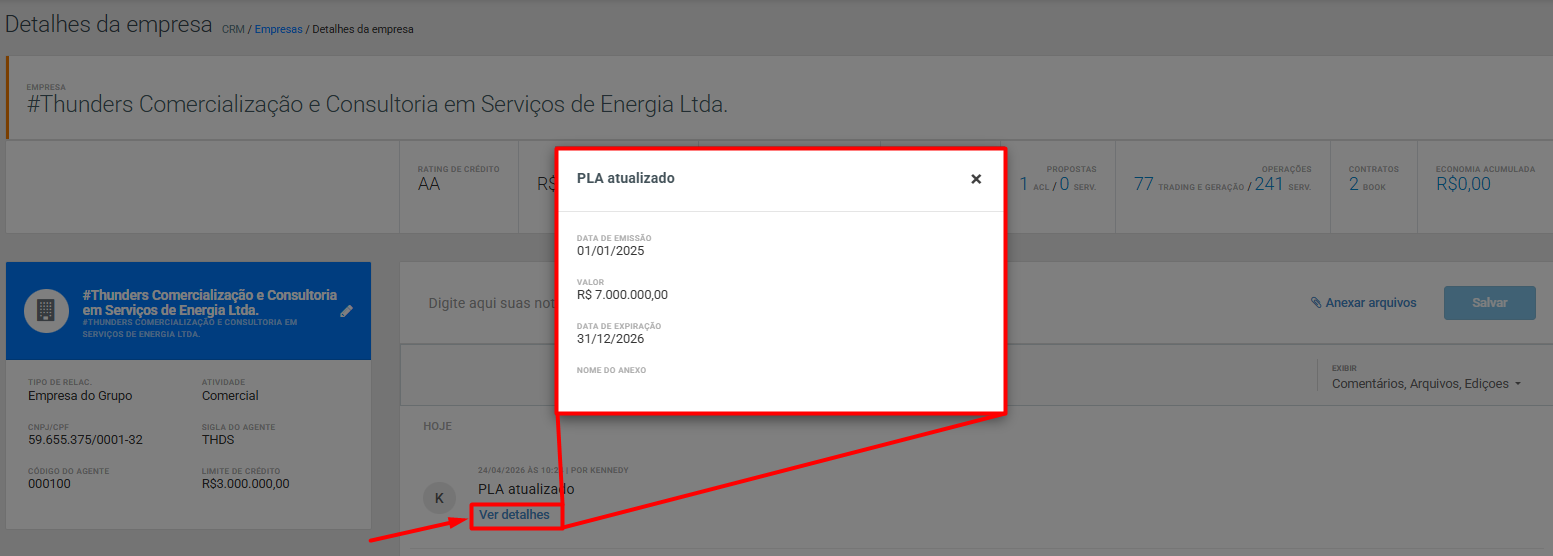 Além do cadastro inicial, todas as alterações realizadas nas informações de PLA ficam registradas na timeline da empresa. Para consultar esse histórico, clique sobre a Razão Social da empresa e acesse os logs disponíveis.