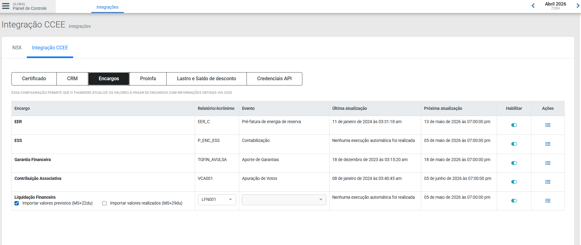 Para habilitar a funcionalidade, acesse: Menu > Global > Painel de Controle > Integrações > Integração CCEE > Encargos.