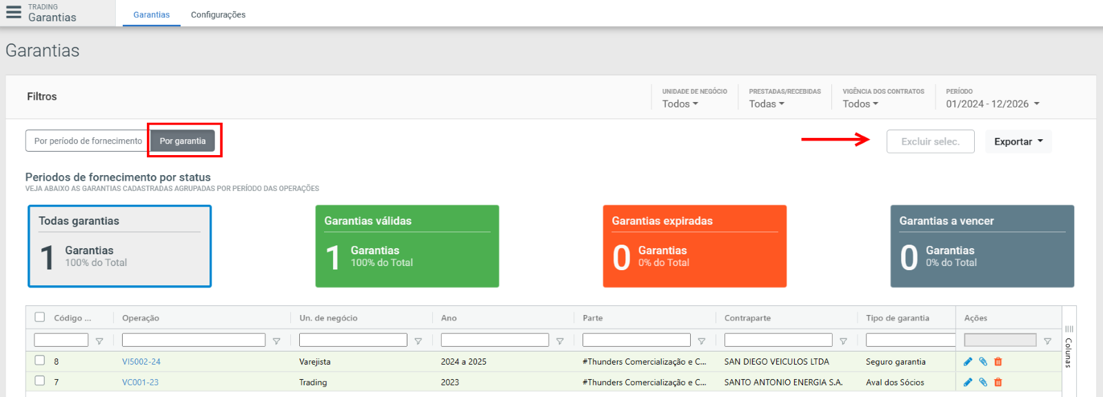 IMPORTANTE: nesta tela de visualização, estes status das garantias são de acordo com a data atual da visualização (dia corrente) e somente é listada as garantias emitidas, para gerir o que não não possui emissão visualizar no modo “Por Período de Fornecimento”.